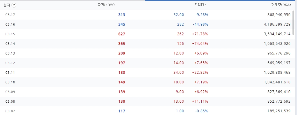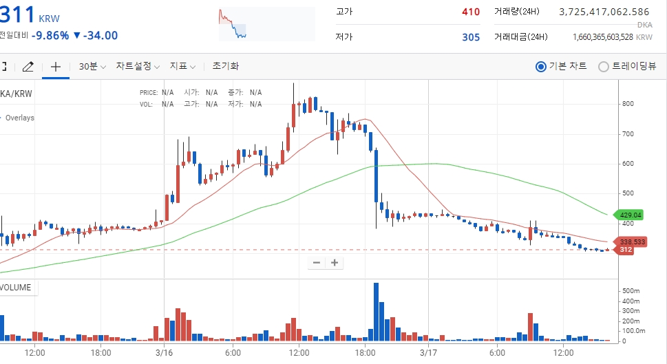 16일 870원까지 치솟은 가상화폐 디카르고는 카카오가 이베이코리아 인수에 입찰 참여를 했다면, 1000원대는 금세 돌파했을 것으로 보입니다. 하지만 인수 불참하면서 급락을 하였고 17일 오전에 다시 반등을 하는 듯했지만, 다시 310원대로 주저앉아버렸습니다.