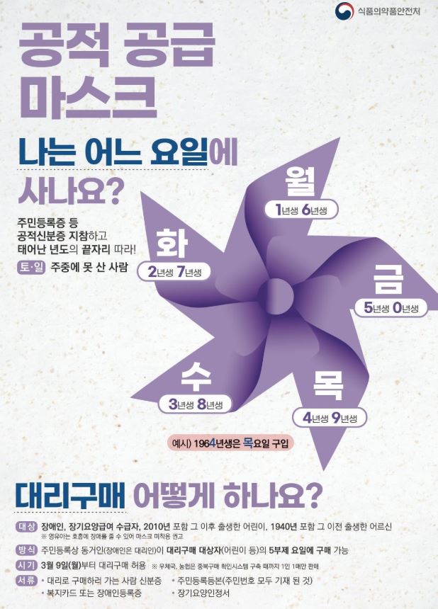 마스크 5부제에 따르면 출생연도 끝자리가 1과 6이면 월요일, 2와 7이면 화요일, 3과 8이면 수요일, 4와 9이면 목요일, 5와 0이면 금요일에만 마스크를 살 수 있다. 예를 들어 출생연도가 1980년인 사람은 끝자리가 0이기 때문에 금요일에, 2001년생은 끝자리가 1로 끝나기 때문에 월요일에 구매가 가능하다. 만약 주중에 마스크를 구입하지 못했다면 주말·휴일인 토요일과 일요일에 구입할 수 있으며, 이때는 5부제 예외가 적용된다.