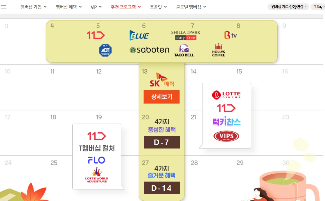 T월드에서 T DAY에는 또 다른 혜택을 준다. VIPS 샐러드바, 11번가 기획전, 롯데월드 종합이용권을 동반1인함께 인당 1만 원에 이용 가능하고, '컬처 만원의 행복' 연극과 뮤지컬을 5천 원에 예매할 수 있다.