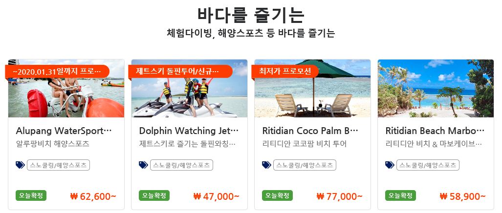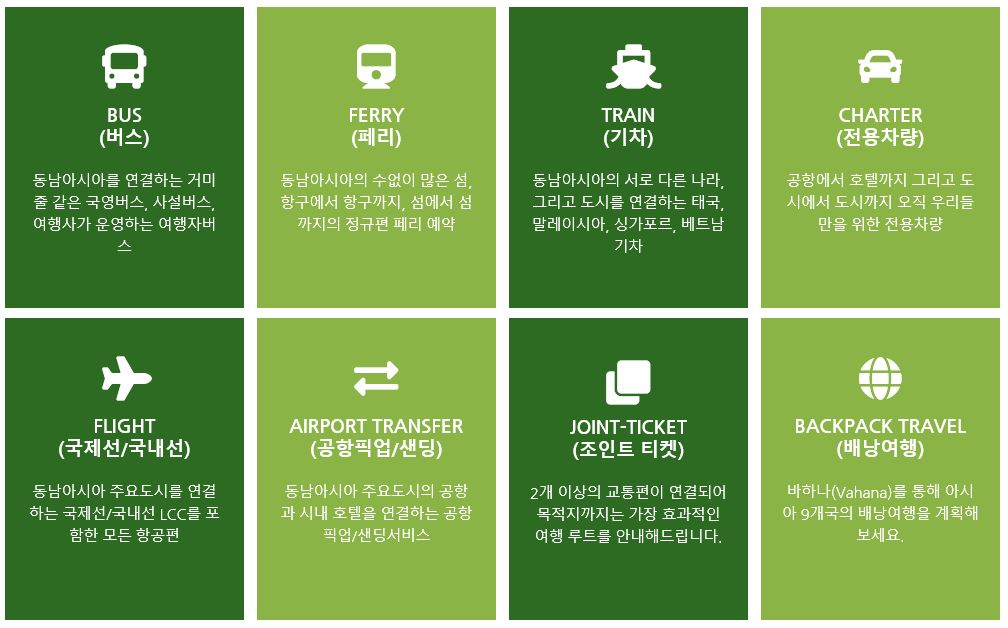 그리고 동남아시아, 동아시아, 남태평양, 유럽, 중동 북중미를 이용할 수 있고 상품들도 있다. 공항 픽업/센딩, 교통, 액티비티, 레스토랑, 입장권, 해양스포츠, 체험다이빙 등 여러 상품들도 함께 이용할 수 있게 되어 있다.