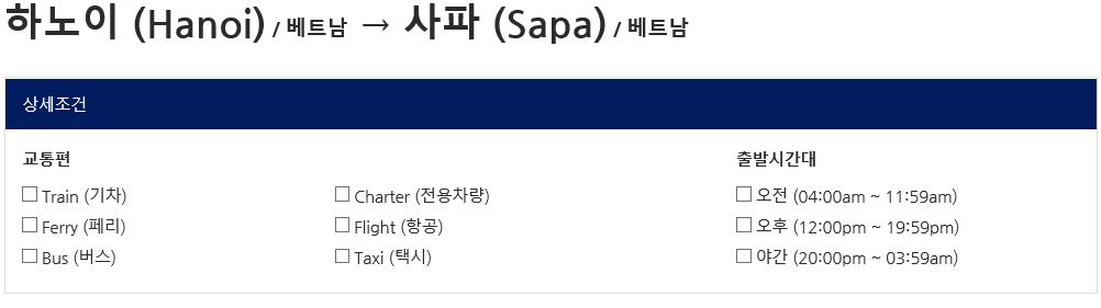 하노이에서 사파를 선택했을 경우이다. 교통편으로 각자 원하는 편을 고르고 시간대를 선택하면 나온다. 일단 기차로 이동할 경우이다.