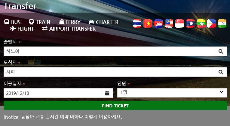 Travelforest에서는 실시간 예약 서비스를 이용할 수 있다. 출발지와 도착지를 선택하고 이용일자와 인원수를 체크한 후에 티켓팅을 하면 된다.
