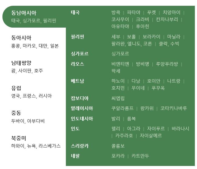 동남아시아 국가는 이용할 수 있는 나라는 총 9개국으로 태국, 베트남, 캄보디아. 말레이시아. 싱가포르, 라오스, 미얀마, 필리핀, 인도이다.