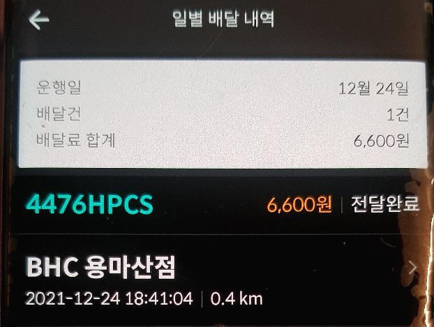 크리스마스 이브날 배달의 민족 화면입니다. 캡처가 안되기 때문에 다른 핸드폰으로 찍었습니다. 배민의 플랫폼은 3.3% 세금 외 운전자 보험료와 산재보험료를 제외합니다. 그래서 하루에 저렇게 1건을 하면 오히려 2000원이 넘는 돈이 빠져서 지급되기 때문에 손해일 수 있습니다. 하지만 이동거리가 쿠팡 이츠에 비해서 짧기 때문에 오토바이 같은 기동력으로 움직일 때는 유리합니다.