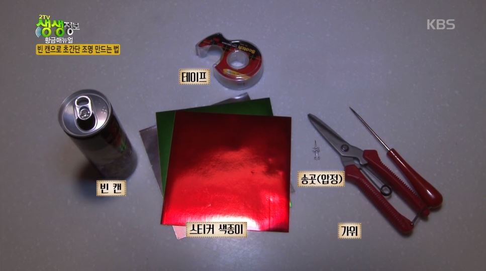 준비물:빈 캔, 스티커 색종이, 송곳(압정), 가위, 테이프