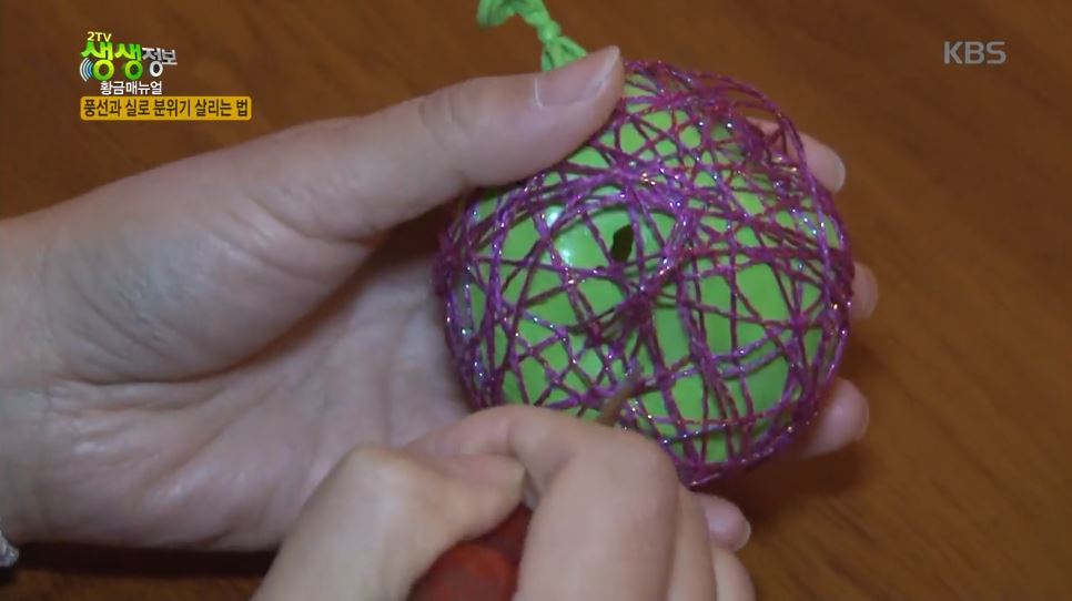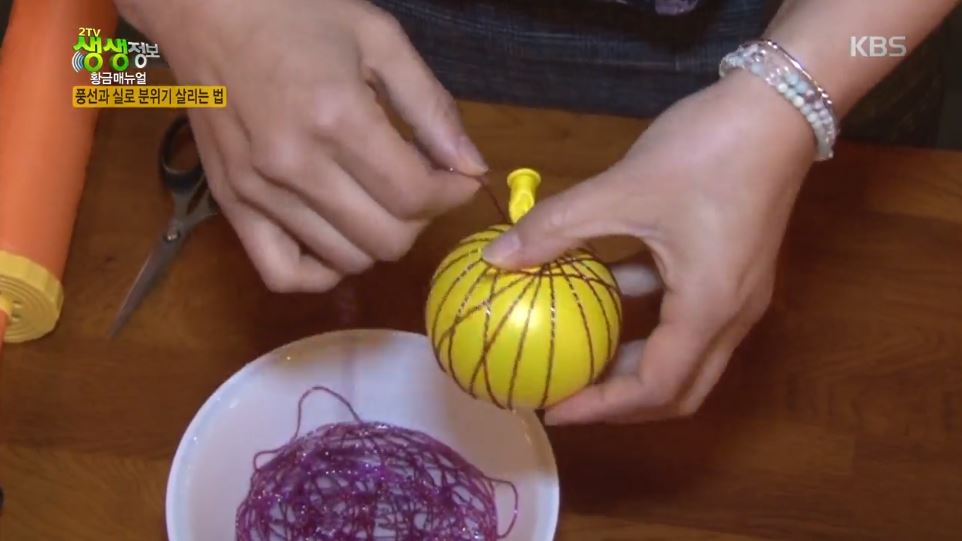 2. 조명 틀이 될 풍선에 바람을 넣고 실을 풍선에 엇갈리도록 감는다.