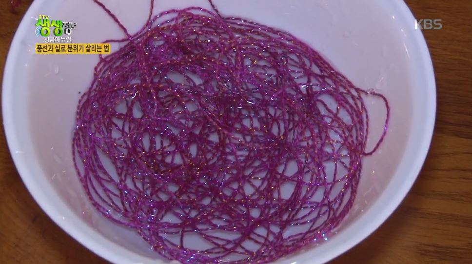 1. 물풀을 그릇에 가득 부은 후 실을 엉키지 않도록 그릇에 담근다.