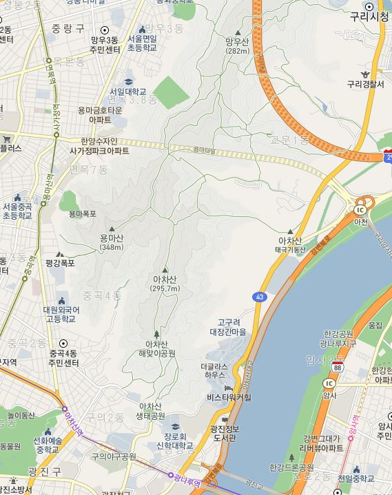 아차산 높이 295.7m - 용마산348m -망우산 282m