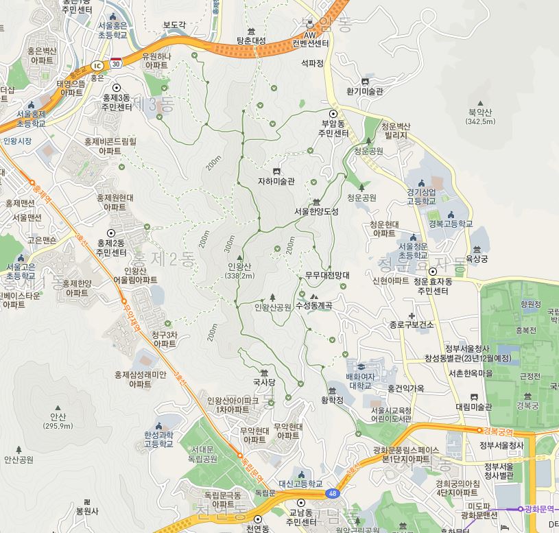 북악산에 올랐다면 인왕산도 함께 오르기도 하는데 등산코스대로 따라가면 됩니다. 윤동주 시인의 언덕에서 서울시내 바라보다가 산책로 따라 천천히 걸으면 됩니다.