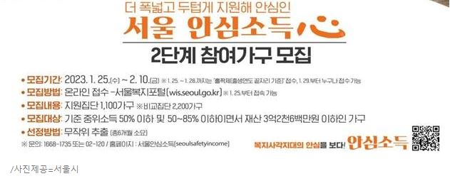 서울시는 '안심소득 시범사업 2단계 참여 가구' 접수를 1월 25일 수요일부터 다음 달 2월 10일까지 진행한다고 밝혔습니다.