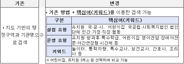 학부모가 내 자녀에 맞는 어린이집과 유치원을 비교하고 신청할 수 있도록 핵심어(키워드)를 이용한 검색도 가능하도록 하여 편의성이 높아질 것으로 기대됩니다.