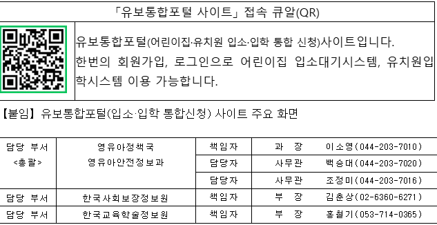 교육부에서 11월 1일(금) ‘유보통합포털’을 개통하고, 2025년도 어린이집·유치원 신입생 입소·입학 신청을 위한 온라인 서비스를 시작합니다.