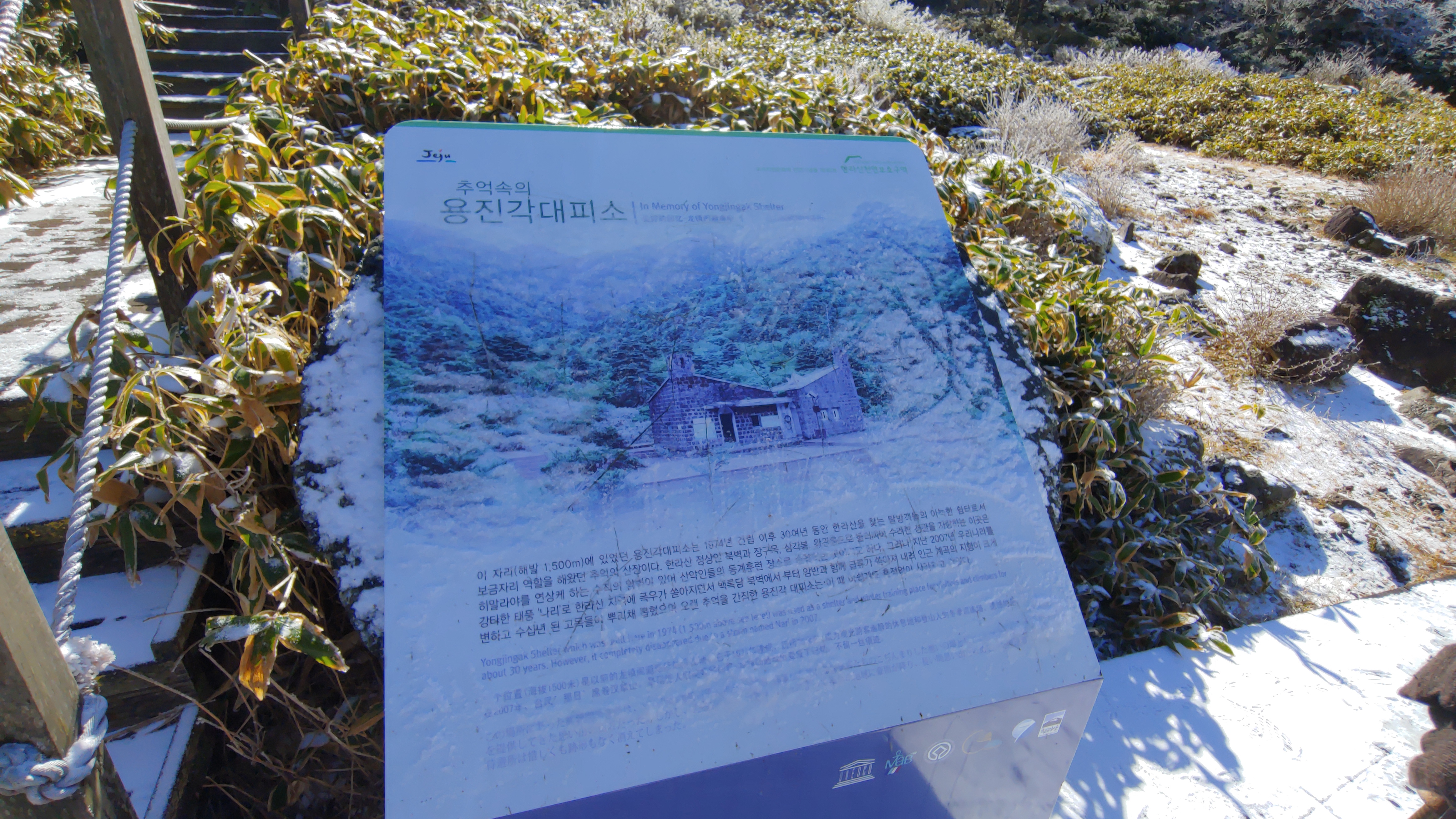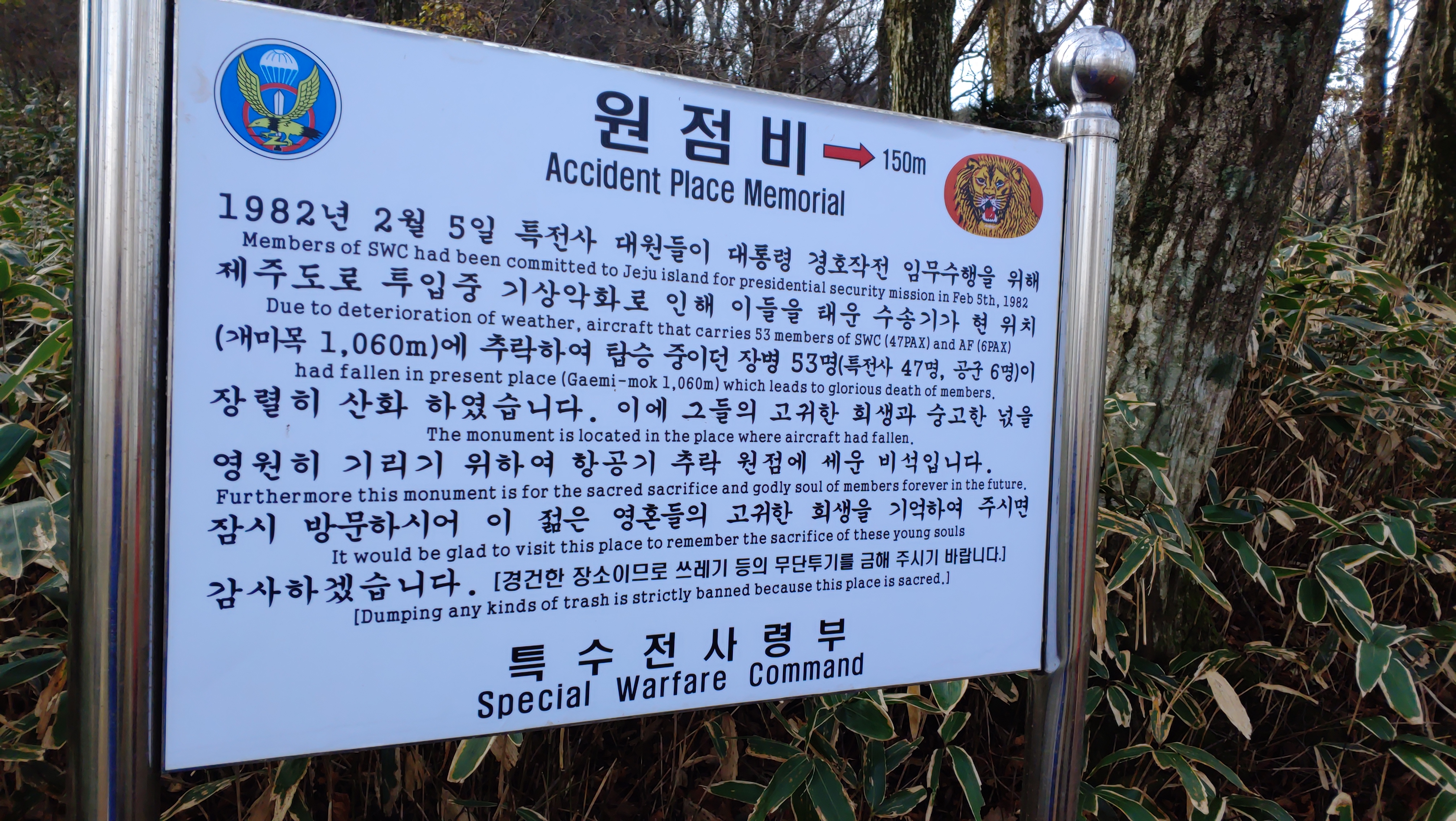 원점비의 간판이 있어서 봤는데 "1982년 2월 5일 특전사 대원들이 대통령 경호작전 임무수행을 위해 제주도로 투입 중 기상악화로 인해 이들을 태운 수송기가 현 위치(개미목 1,060m)에 추락하여 탑승 중이던 장병 53명(특전사 47명, 공군 6명)이 장렬히 산화하였습니다. 이에 그들의 고귀한 희생과 숭고한 넋을 영원히 기리기 위하여 항공기 추락 원점에 세운 비석입니다. 잠시 방문하시어 이 젊은 영혼들의 고귀한 희생을 기억하여 주시면 감사하겠습니다."라는 글이 적혀 있었다.