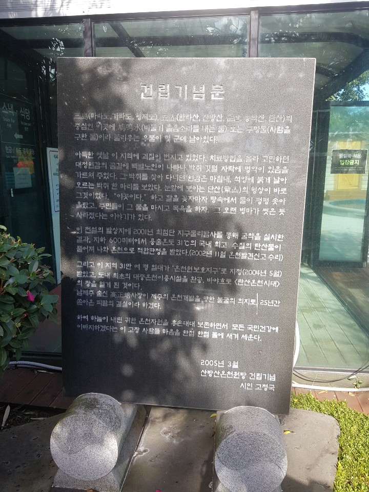 온천이 개발되고 개장한지는 올해로 14년밖에 되지 않은 산방산 탄산온천이다. 전설로 내려오는 이야기로 인해서 개발된 곳이라고 하니 참 독특한 내용이었다. 고혈압탕, 심장탕으로 알려진 곳으로 고혈압, 말초혈관 순환장애, 류마티스 등 성인병 치료와 피로 해소 및 피부미용에도 효과를 볼 수 있다고 한다. 한번 갔다 와서는 모르겠다.