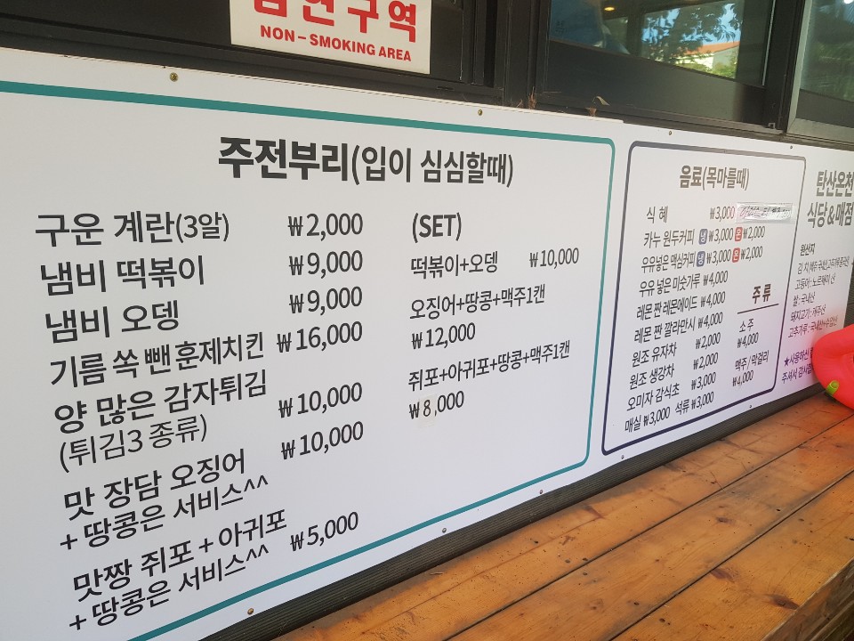 온천과는 별개로 운영되는 식당이라고 한다. 우리는 이미 외부에서 식사를 하고 들어와서 식혜 하나만 마셨다. 물에 몸을 담그고 식혜를 마시니 달달하니 좋았다. 소소하게 간식으로 먹을 만한 가격대로 판매를 했으면 떡볶이를 사 먹었을 텐데 그 부분이 아쉽다.