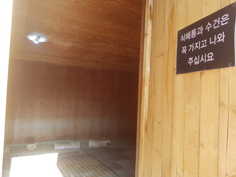 야외 노천탕 전용 황토방으로 10명 정도 수용할 수 있는 작은 방으로 되어 있었다. 밖이 쌀쌀하니 안에 들어와서 몸을 녹일 때는 안 뜨겁더니 조금만 지나니 뜨거워서 20분 정도만 이용하고 나갔다.