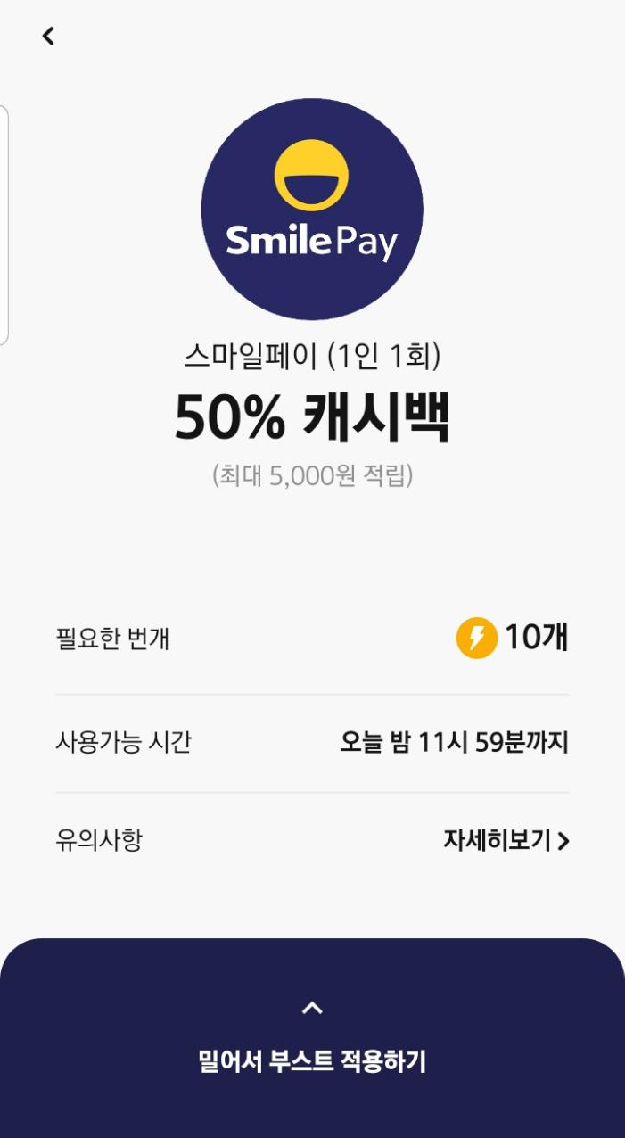 예시) 스마일 페이 같은 경우 번개 10개를 써서 최대 5000원 적립을 받을 수 있습니다. 그럼 만 원짜리를 구매하면 5000원만 사용하게 되는 것입니다. 바로 적립금 5000원이 들어오는 걸 확인할 수 있습니다.