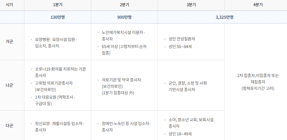 1분기에 130만 명, 2분기에 900만 명, 3~4분기에 3,325만으로 하는데 효과적인 전 국민 접종 방법을 지속적으로 검토하고 추진하기로 하였습니다.