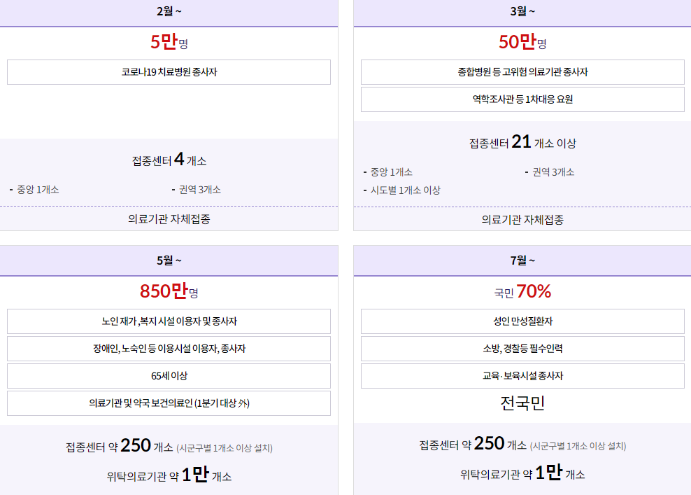 1분기에 130만 명, 2분기에 900만 명, 3~4분기에 3,325만으로 하는데 효과적인 전 국민 접종 방법을 지속적으로 검토하고 추진하기로 하였습니다.