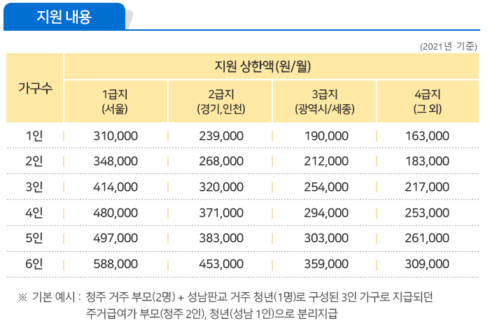 주거급여 수급가구(기준 중위소득 45% 이하 가구) 내 학업이나 구직 등을 목적으로 부모와 따로 거주하는 30세 미만 미혼자녀를 대상으로 합니다.